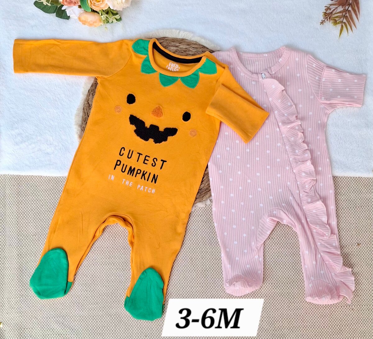 Découvrez ces adorables combinaisons pour bébés de 3 à 6 mois. Douces et confortables, elles sont parfaites pour l'automne. La combinaison orange représente un citrouille mignon, idéale pour les garçons, tandis que la rose est parfaite pour les filles avec ses détails à volants.