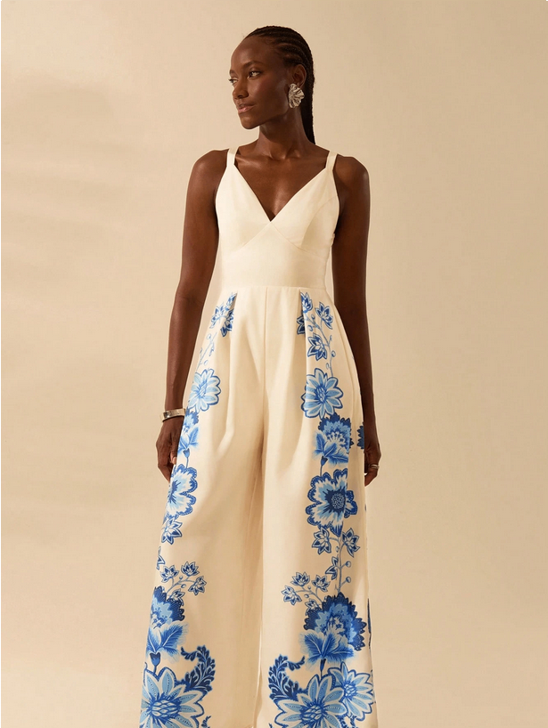 Élégante combinaison en tissu léger avec des motifs floraux bleus accrocheurs. Parfaite pour les événements estivaux chic ou les dîners élégants. Coupe sans manches avec encolure en V pour un look sophistiqué.