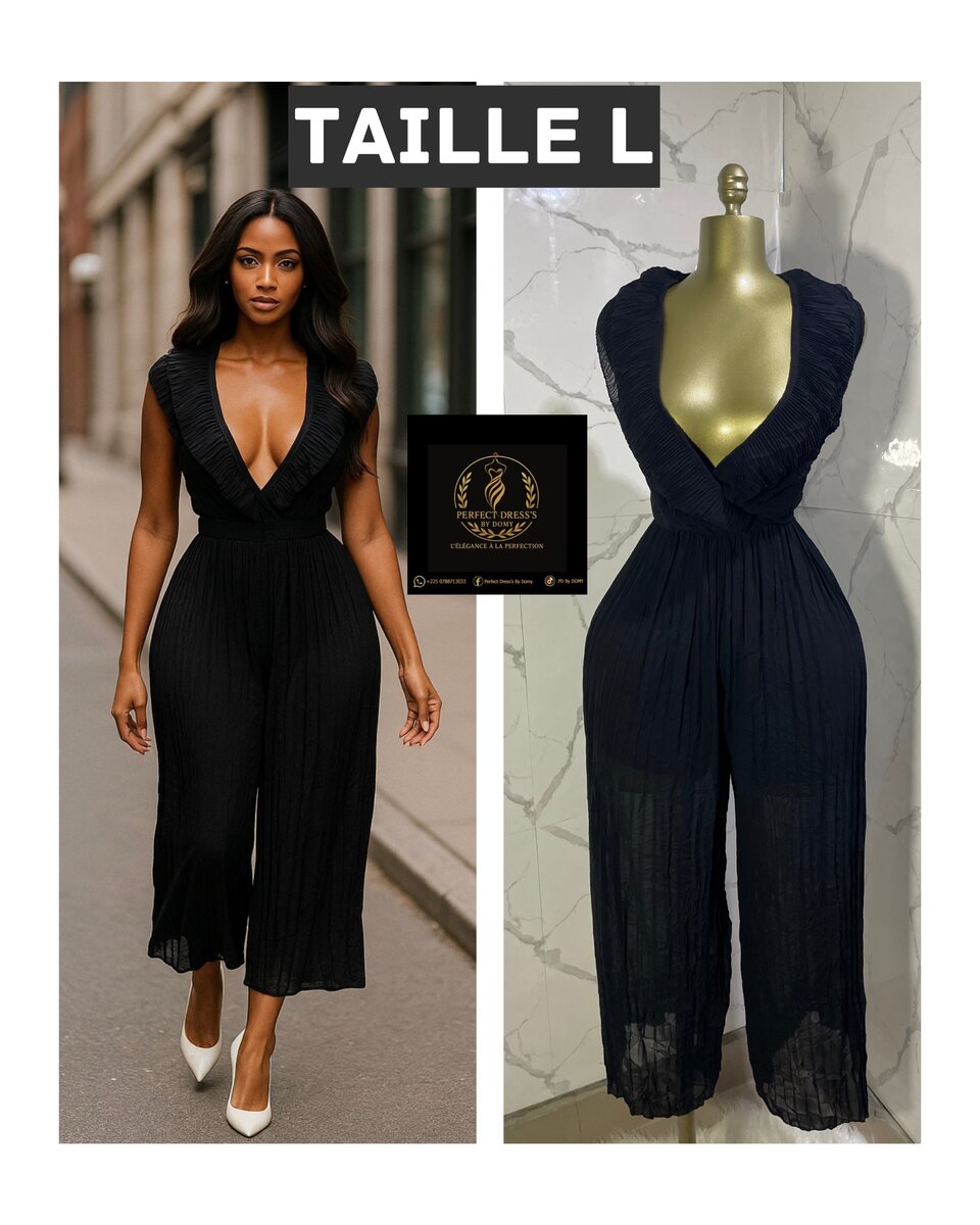Découvrez cette combinaison chic pour femme, parfaite pour toutes les occasions. Avec son décolleté plongeant et sa taille ajustée, elle souligne votre silhouette avec élégance. Idéale pour une soirée ou un événement spécial, elle vous garantit un look sophistiqué et tendance. Disponible en taille L.