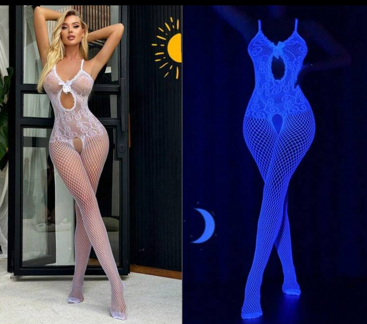 Cette combinaison en résille est idéale pour pimenter vos soirées spéciales. Conçue avec un motif en dentelle unique et un effet lumineux sous lumière noire, elle offre une allure séduisante et mystérieuse. Fabriquée avec des matériaux élastiques pour une coupe ajustée et confortable. Parfaite pour des moments inoubliables ou comme cadeau romantique.