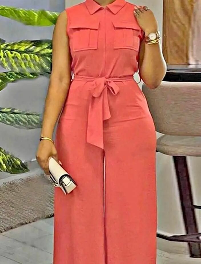 Combinaison femme sans manches, design élégant avec ceinture et poches. Confortable et tendance, idéale pour les occasions spéciales ou décontractées.