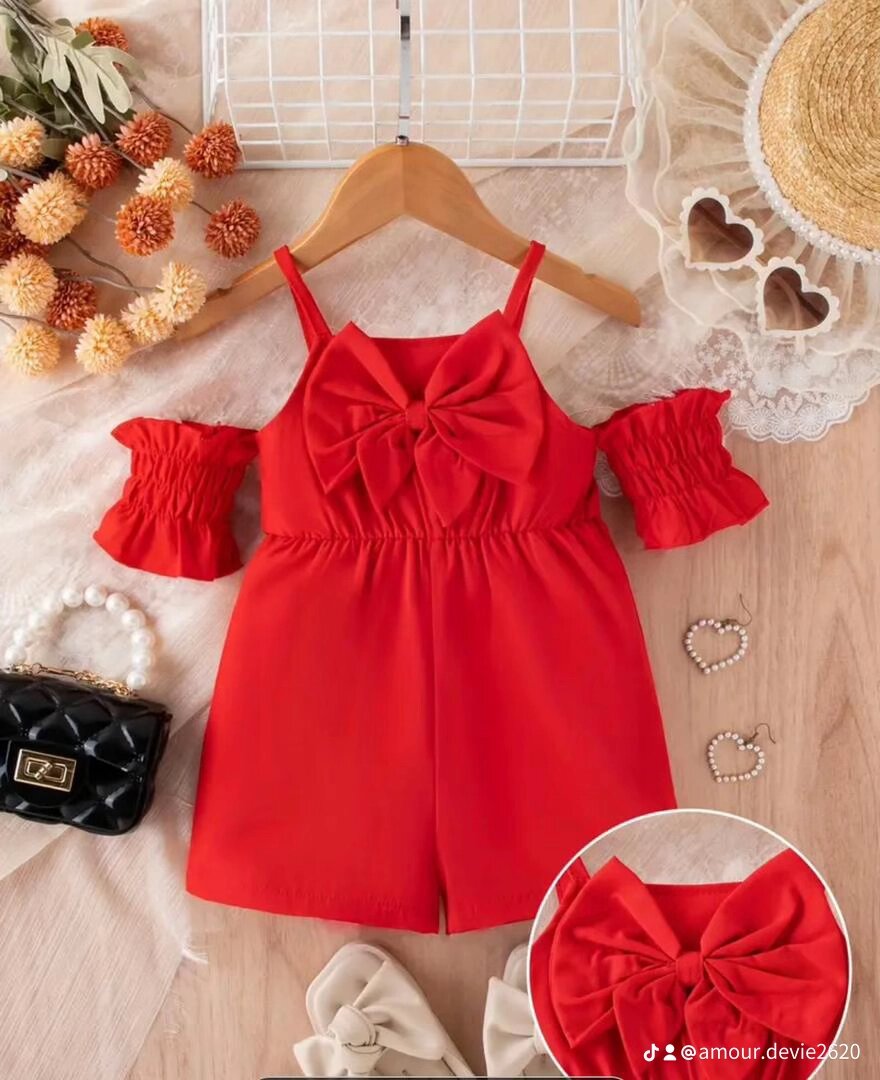Cette charmante combinaison rouge pour filles avec un grand nœud et des épaules dénudées est idéale pour les occasions spéciales. Fabriquée dans un tissu doux, elle offre confort et style. Parfaite pour une fête ou une sortie estivale, elle garantit un look adorable et tendance. Pour enfant de 6 mois à 9mois