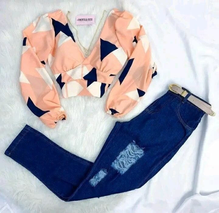 Ensemble femme élégant comprenant un haut à motifs géométriques et un jean déchiré. Confortable et tendance, idéal pour une tenue décontractée chic.
