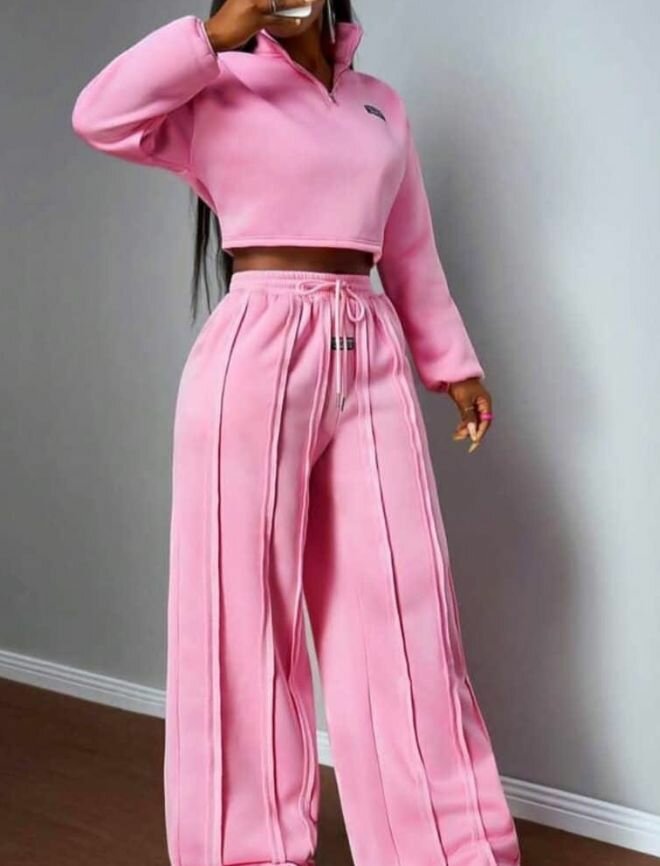 Ensemble survêtement rose pour femme, composé d'un haut courté et d'un pantalon ample, parfait pour un look décontracté et confortable. Idéal pour le quotidien ou les activités sportives.