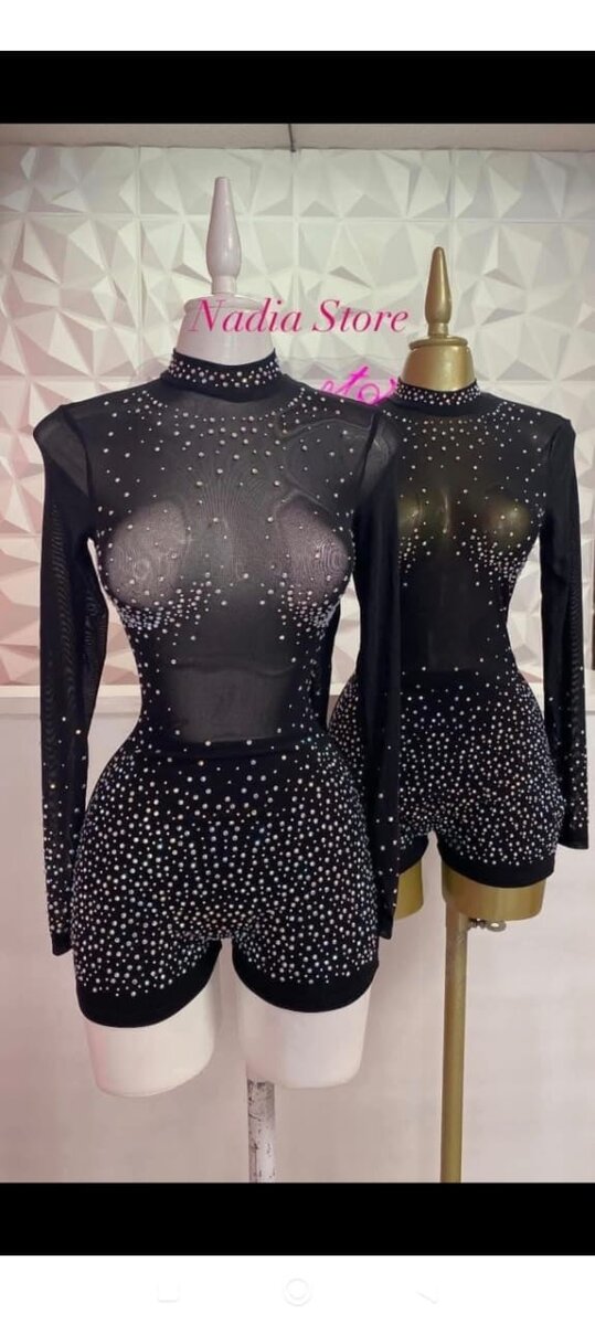 Éblouissez avec cette combinaison noire ornée de strass scintillants, parfaite pour une soirée élégante ou une sortie spéciale. Ajustement confortable et allure séduisante assurés.