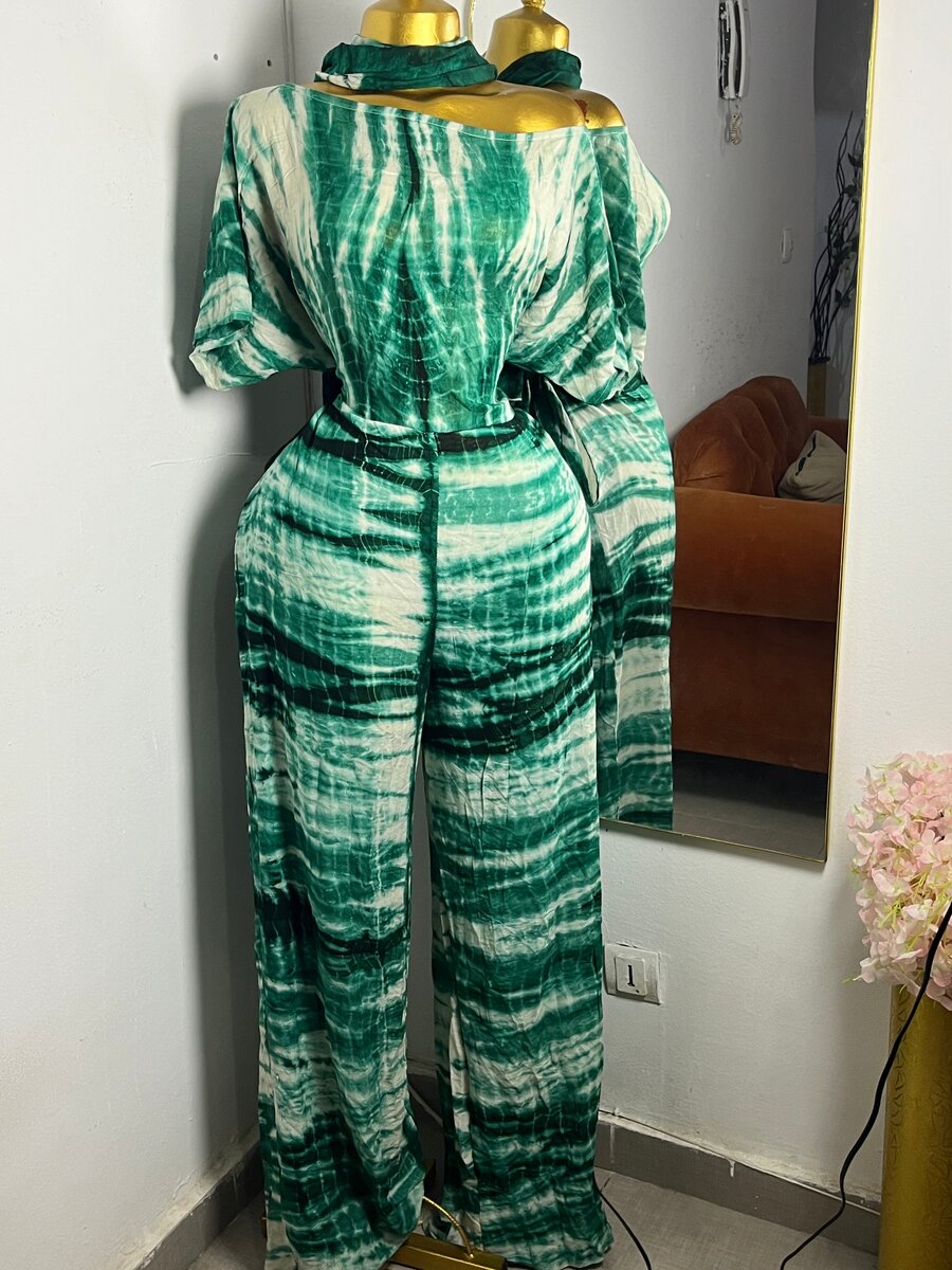 Optez pour cette combinaison tie-dye verte élégante, parfaite pour les occasions chic et décontractées. Confectionnée dans un tissu doux et fluide, elle allie confort et style. Sa coupe flatteuse et son motif unique en font un choix tendance pour se démarquer. Idéale pour un événement d'été ou une sortie entre amis. Soyez au centre de l'attention avec ce look audacieux et contemporain.