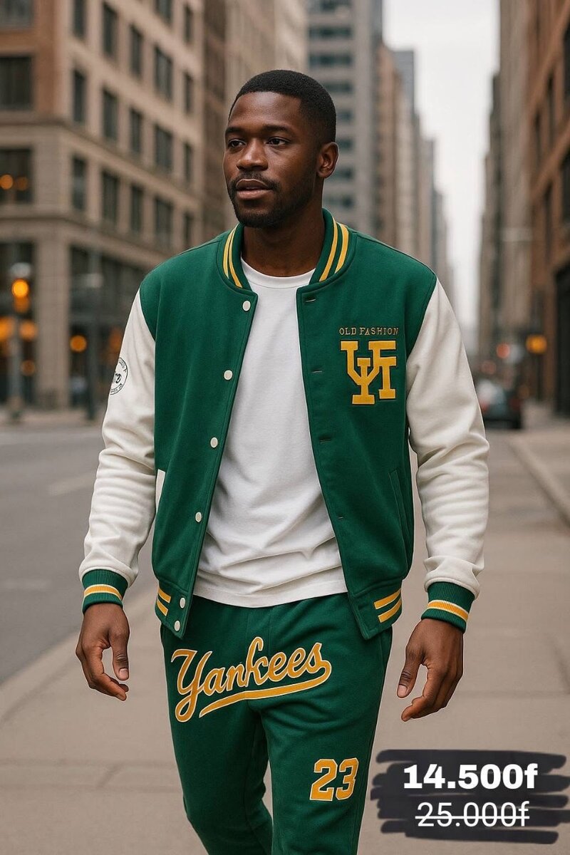 Le Yankees Green Spirit est lensemble parfait pour ceux qui veulent afficher un style urbain maîtrisé tout en restant confortables. Conçu dans un tissu doux et résistant, cet ensemble 2 pièces (veste + pantalon) allie le charme vintage du college américain à lattitude décontractée de la street culture moderne.