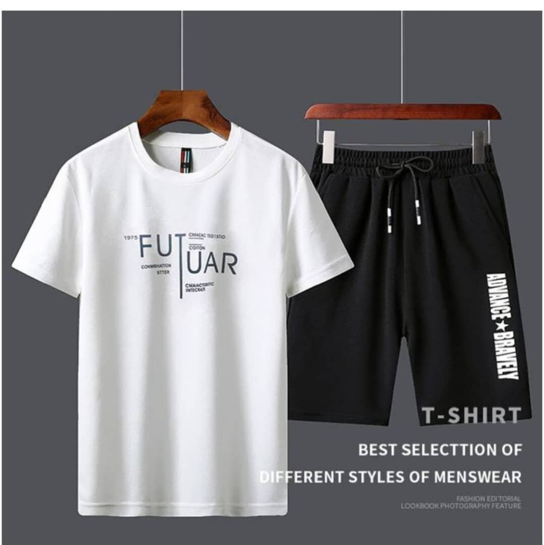 L'image présente un ensemble pour homme composé d'un t-shirt blanc et d'un short noir. Le t-shirt arbore des inscriptions combinant des chiffres et des lettres : "1975", "CMACAC TROISTIO", "FUTUAR", "CONUSHATION", "CMAACTRIC" et "INTICRAS". Le short noir affiche l'inscription "ADVANCE BRAVELY" sur le côté gauche. L'image inclut également du texte promotionnel mentionnant "T-SHIRT BEST SELECTTION OF DIFFERENT STYLES OF MENSWEAR FASHION EDITORIAL LOOKBOOK PHOTOGRAPHY FEATURE".