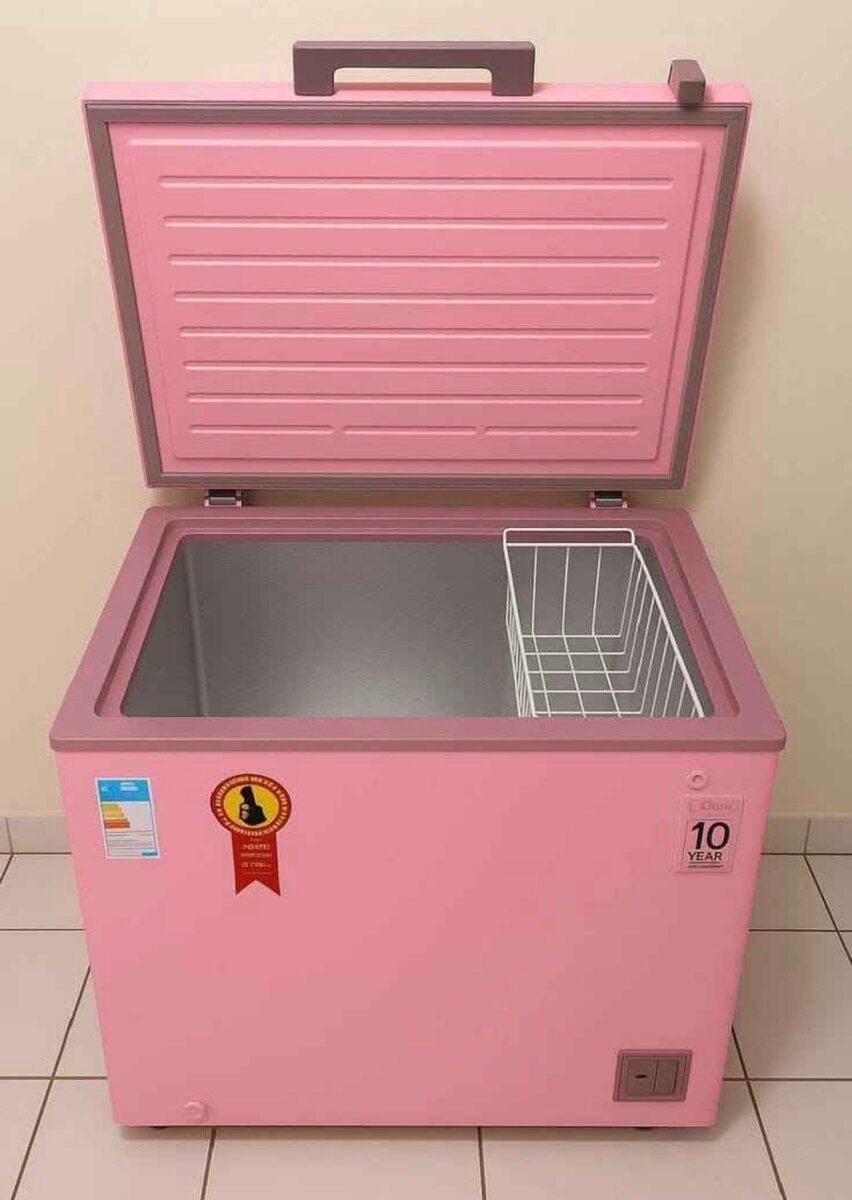 Congélateur coffre rose compact et efficace. Idéal pour conserver vos aliments sur le long terme. Faible consommation d'énergie. Garantie 10 ans.