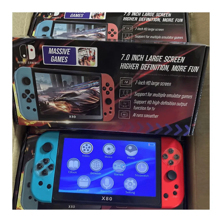 Console de jeux portable X80 avec écran haute définition de 7 pouces. Prend en charge de multiples jeux d'émulateurs et une sortie TV. Idéale pour les passionnés de jeux en déplacement. Profitez d'une expérience de jeu fluide et d'une haute qualité d'image où que vous soyez.