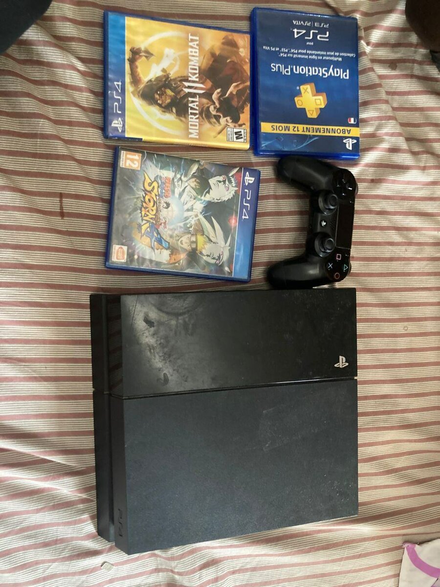 Console PS4 avec manette et jeux populaires. Prête pour une expérience de jeu intense avec Mortal Kombat et Naruto. Idéale pour les amateurs de jeux vidéo!