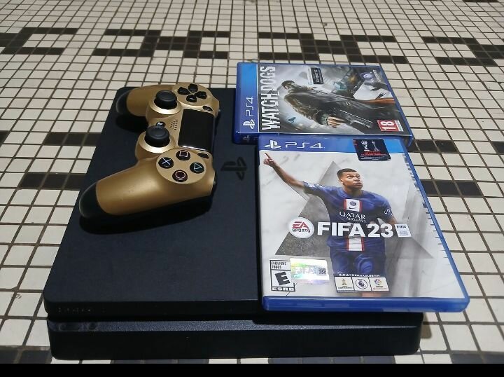 Console PlayStation 4 Slim avec manette dorée et jeux vidéo inclus. Offre idéale pour les amateurs de gaming.