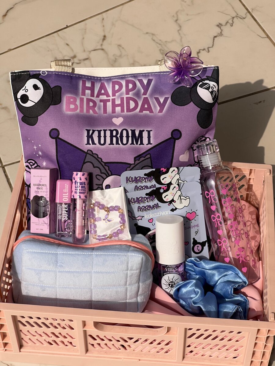 Découvrez notre corbeille cadeau Kuromi pour fille, remplie de produits de beauté et accessoires. Un cadeau idéal pour les fans de Sanrio.