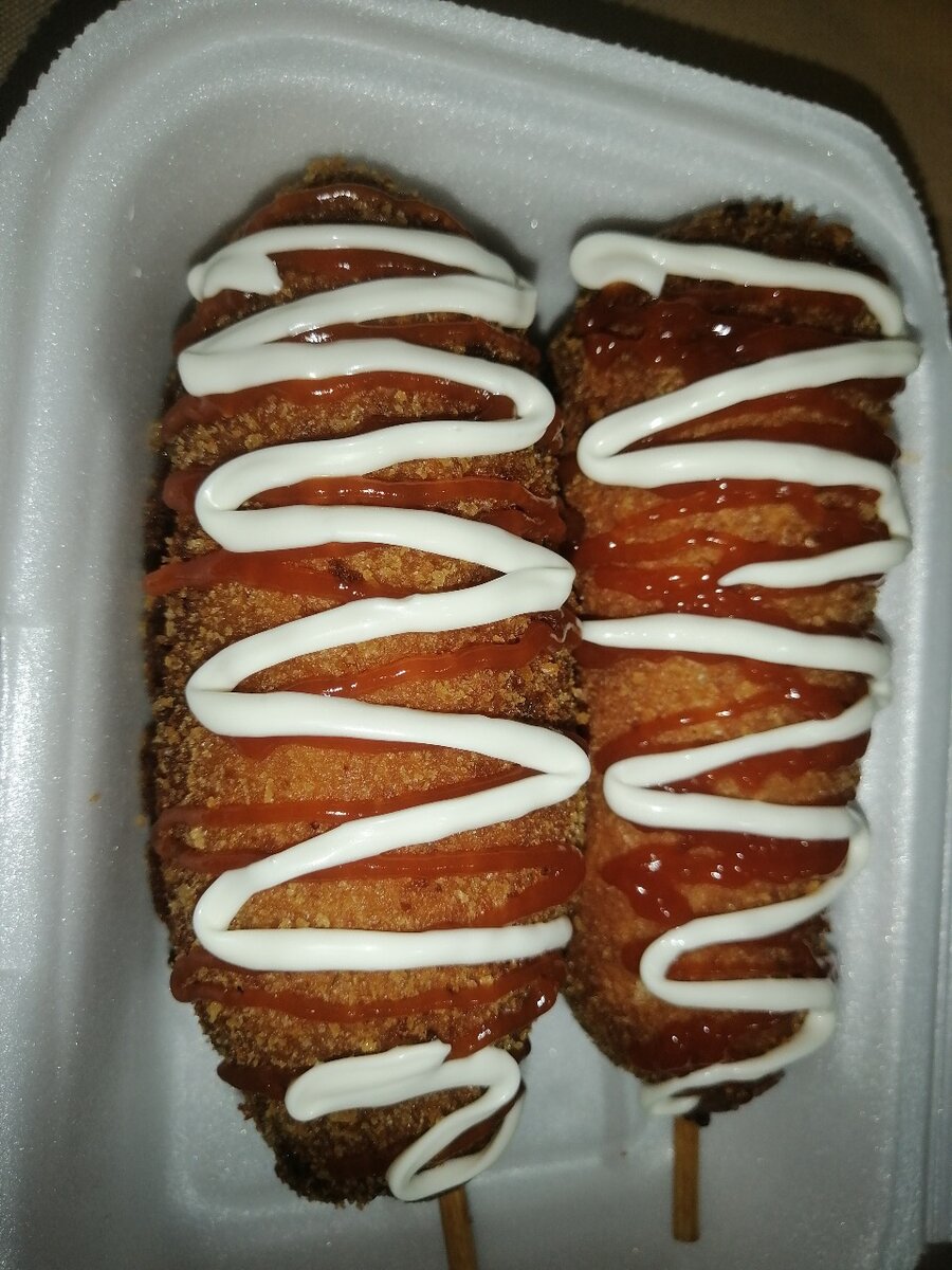 Savourez ces corn dogs croustillants à l'extérieur et tendres à l'intérieur, garnis de ketchup et de mayonnaise pour un goût irrésistible. Parfait pour des repas rapides et délicieux entre amis ou en famille.
