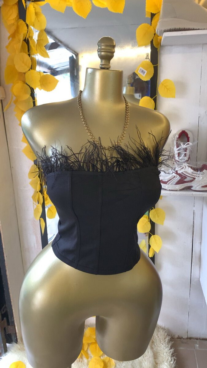 Ce corset bustier noir avec plumes est un choix parfait pour un look élégant et sophistiqué. Parfait pour des soirées ou des événements spéciaux.