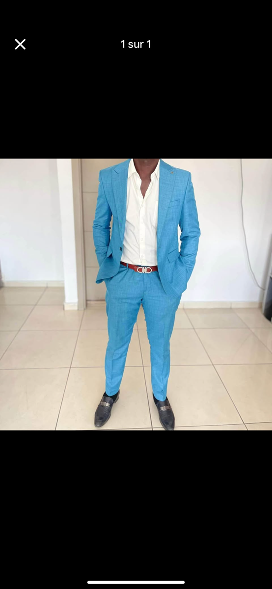 Ce costume bleu contemporain est parfait pour les occasions formelles ou professionnelles. Fabriqué avec des matériaux de haute qualité pour un confort et une sophistication inégalés. Idéal pour les hommes cherchant à se démarquer avec style. Portez-le avec une chemise blanche pour un look classique et accrocheur.