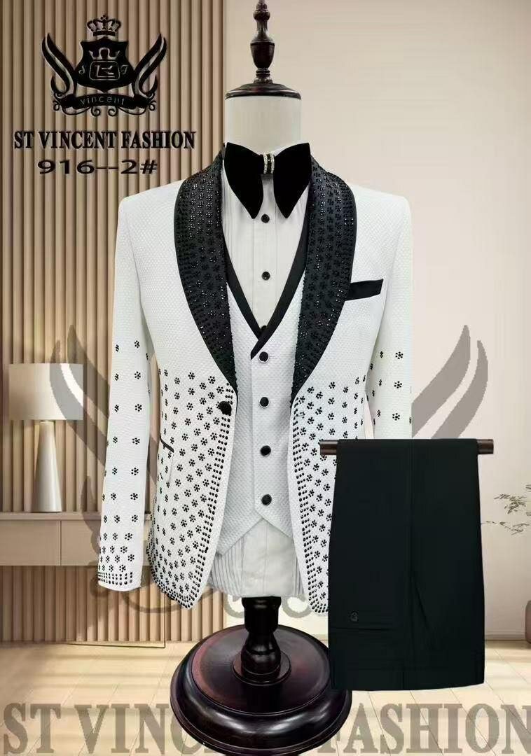 Ce costume de soirée blanc et noir, orné de détails luxueux, est idéal pour des occasions spéciales. Conçu avec une attention aux détails, il offre une allure sophistiquée et unique. Parfait pour des événements formels ou des célébrations inoubliables.