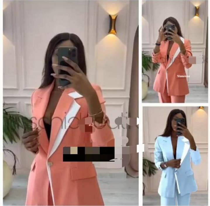 Découvrez l'élégance de ce costume tailleur pour femme, disponible en rose pêche et bleu ciel. Parfait pour le bureau ou une soirée, il offre un look chic et moderne. Adoptez le style avec un confort inégalé.