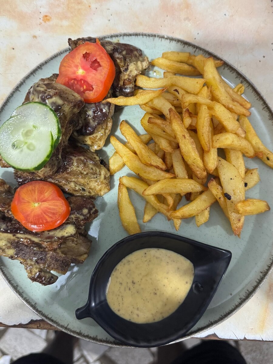 Savourez ce délicieux plat composé de morceaux de porcs juteux et croustillants, accompagnés de frites dorées à la perfection et de légumes frais. Une sauce crémeuse complète ce repas succulent. Parfait pour un dîner rapide