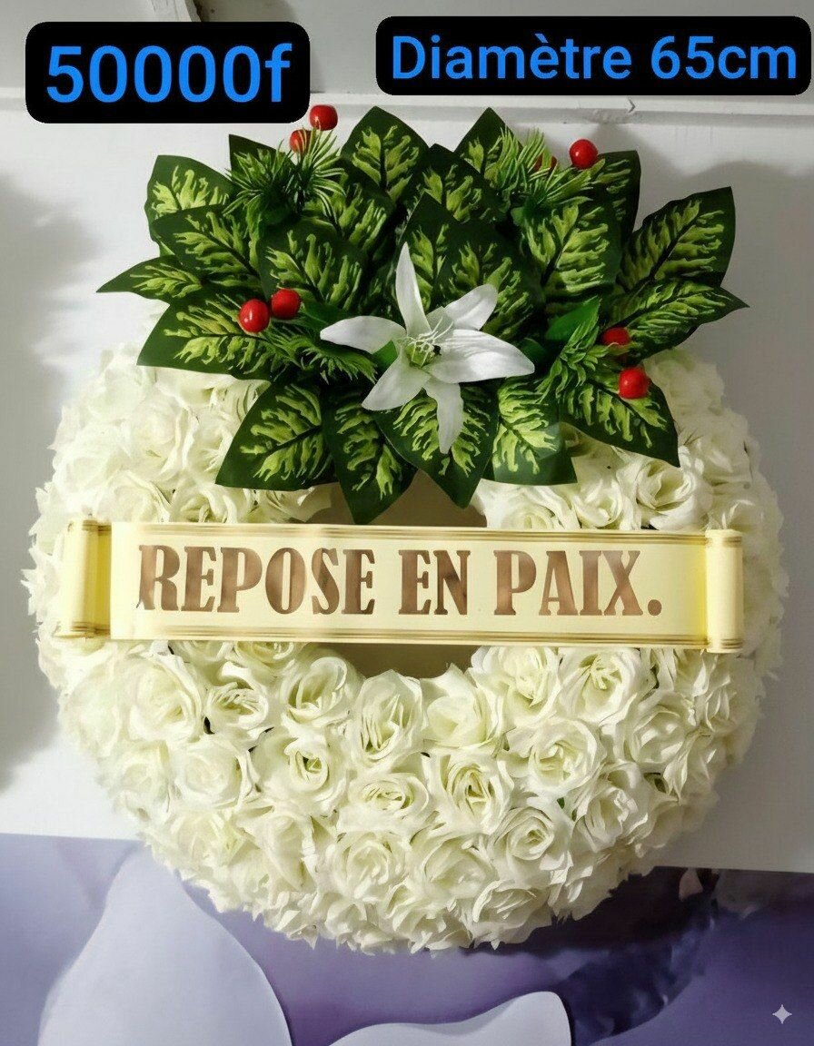 Couronne funéraire élégante avec fleurs artificielles blanches et message "Repose en Paix". Idéale pour rendre hommage à vos proches avec dignité. Diamètre de 65 cm pour une présence marquante.