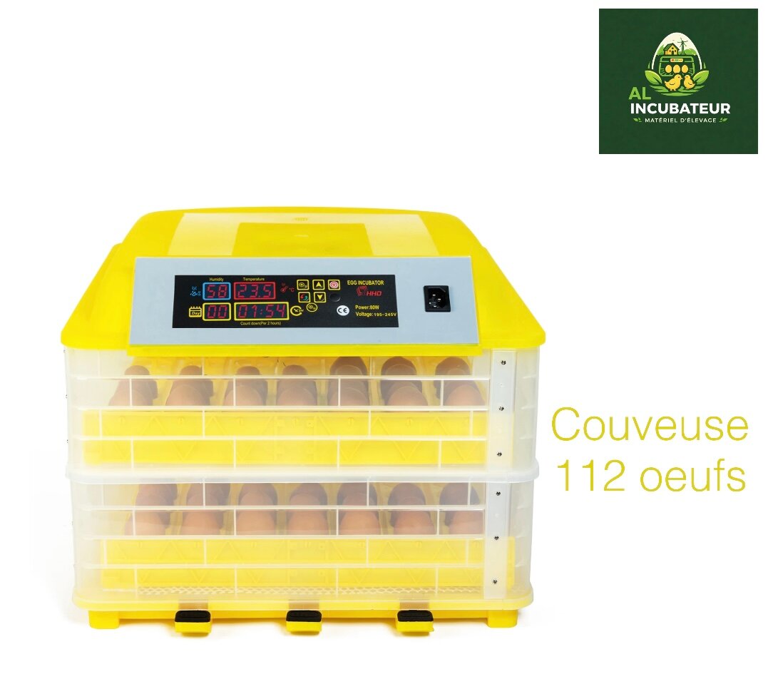 Incubateur automatique de 112 œufs, idéal pour poules, canards et cailles. Température et humidité réglables, retournement auto, faible consommation, taux déclosion élevé.