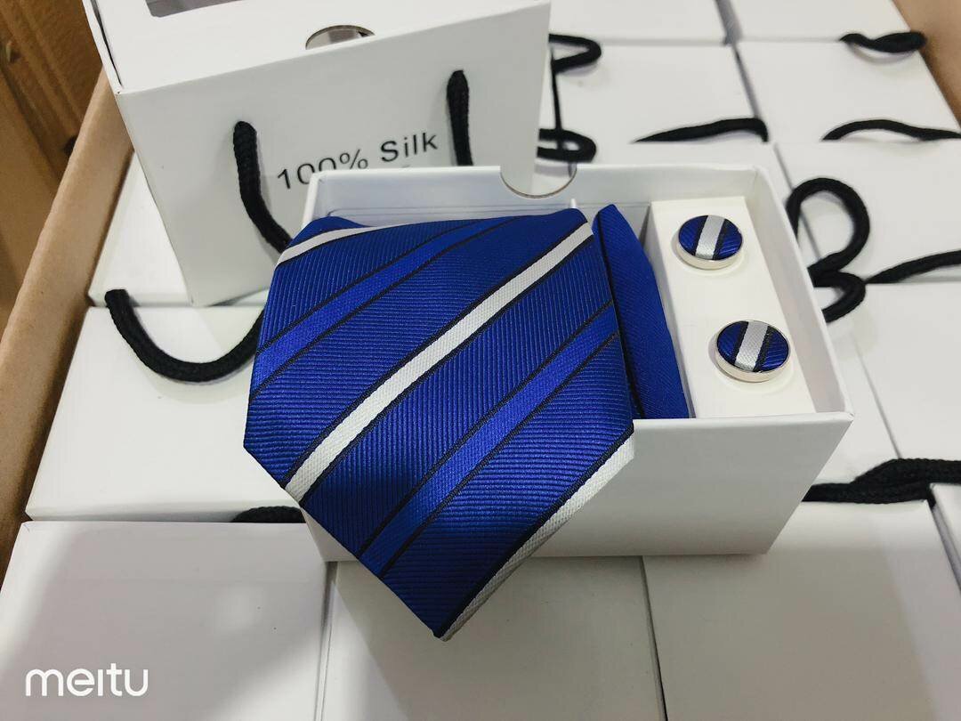 Ajoutez une touche de sophistication à votre tenue avec cette cravate en soie bleue, livrée avec boutons de manchette assortis. Parfaite pour les occasions formelles ou professionnelles, elle offre un look raffiné et moderne.