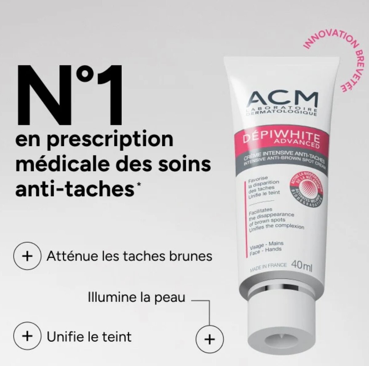 La Crème Anti-taches Dépiderme ACM réduit efficacement les taches brunes et illumine votre teint. Formulée pour le visage et les mains, elle unifie votre peau, vous offrant une apparence plus éclatante. Parfaite pour une utilisation quotidienne afin de maintenir une peau radieuse et uniforme. Fabriquée en France, elle est idéale pour tous ceux cherchant à améliorer l'apparence de leur peau.