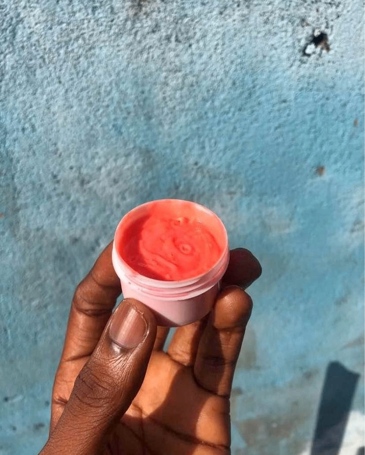 La crème de lèvre rose et le gommage s'utilise tout deux pour résultat plus visible et parfait