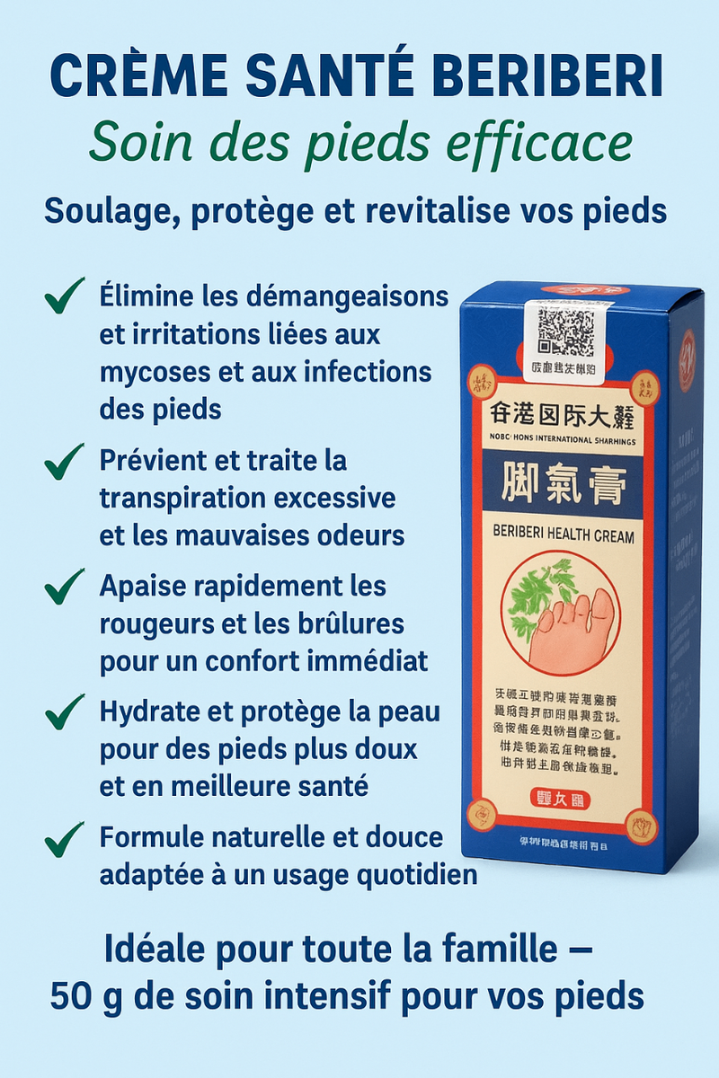 Soulagez et revitalisez vos pieds avec la Crème Santé Beriberi. Élimine démangeaisons, apaise et hydrate pour un confort optimal. Idéale pour toute la famille.