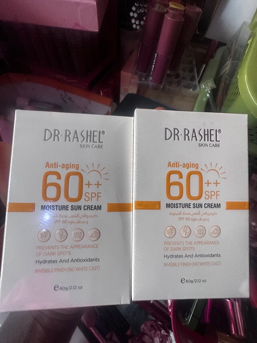 Crème solaire hydratante anti-âge Dr Rashel SPF 60. Protège contre les taches solaires, hydrate et offre une protection antioxydante. Idéale pour une peau jeune et éclatante.