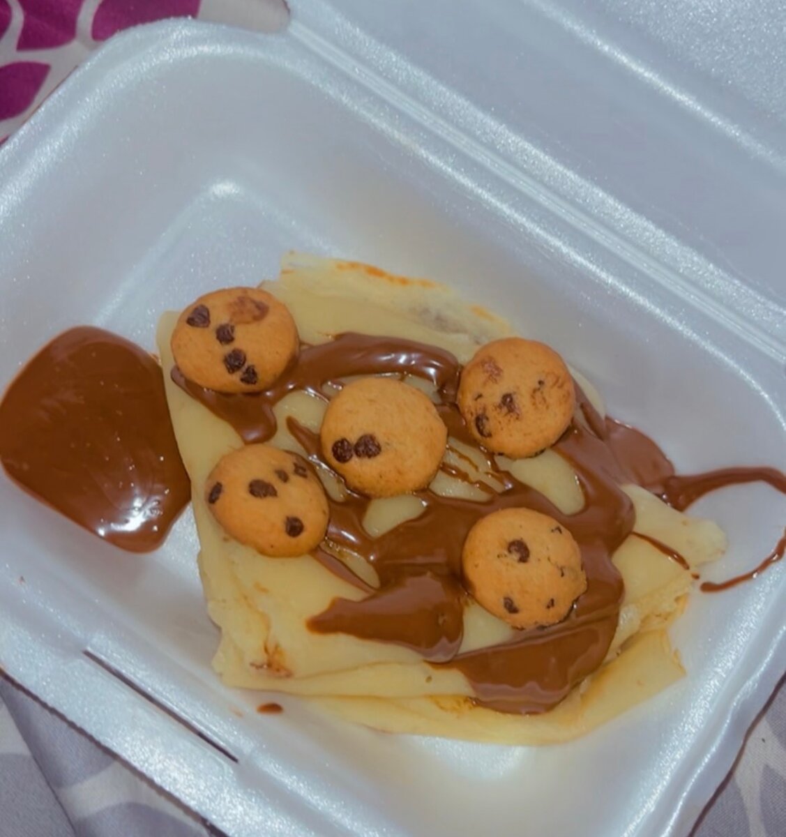 Délectez-vous avec cette crêpe moelleuse recouverte d'une sauce chocolat onctueuse et agrémentée de délicieux cookies. Parfait pour une pause gourmande ou un dessert de fête. Un choix irrésistible pour les amateurs de douceurs!