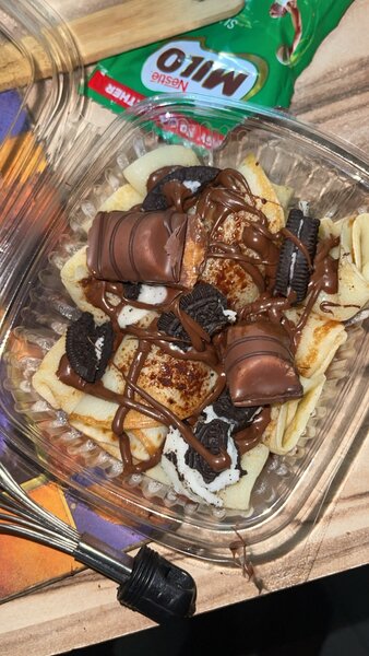 Dégustez nos crêpes délicieusement garnies de chocolat fondant et de biscuits croquants. Parfaites pour un dessert gourmand ou un encas sucré.
