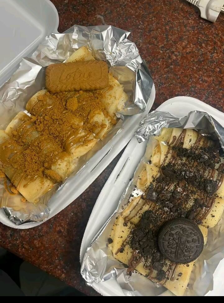 Savourez ces crêpes gourmandes, l'une garnie de Lotus croquant et l'autre d'Oreo chocolaté. Parfaites pour les amateurs de douceurs!