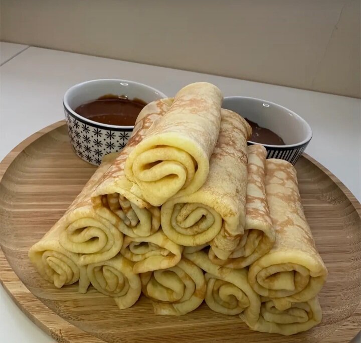 Découvrez nos crêpes maison dorées, accompagnées d'une sauce au chocolat onctueuse. Parfaites pour un petit-déjeuner gourmand ou un goûter. Texture légère et savoureuse, idéales pour ravir vos papilles!