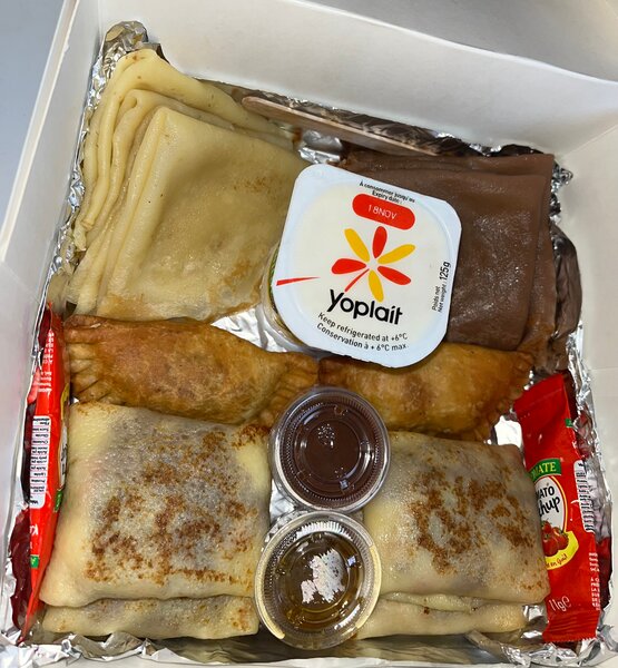 Découvrez nos crêpes fourrées, parfaites pour un déjeuner savoureux ou un en-cas délicieux. Avec une cuisson dorée et une garniture généreuse, elles sont idéales pour toute occasion. Ajoutez un supplément de fromage fondu pour une expérience encore plus riche. Parfaites pour être partagées en famille ou entre amis.
