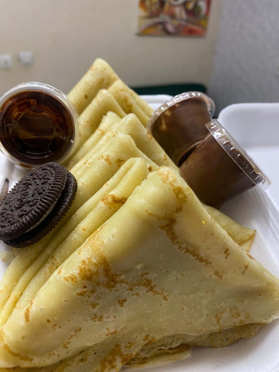 Dégustez nos crêpes savoureuses accompagnées de sauce chocolat et biscuits croquants. Parfaites pour un dessert ou un goûter gourmand.