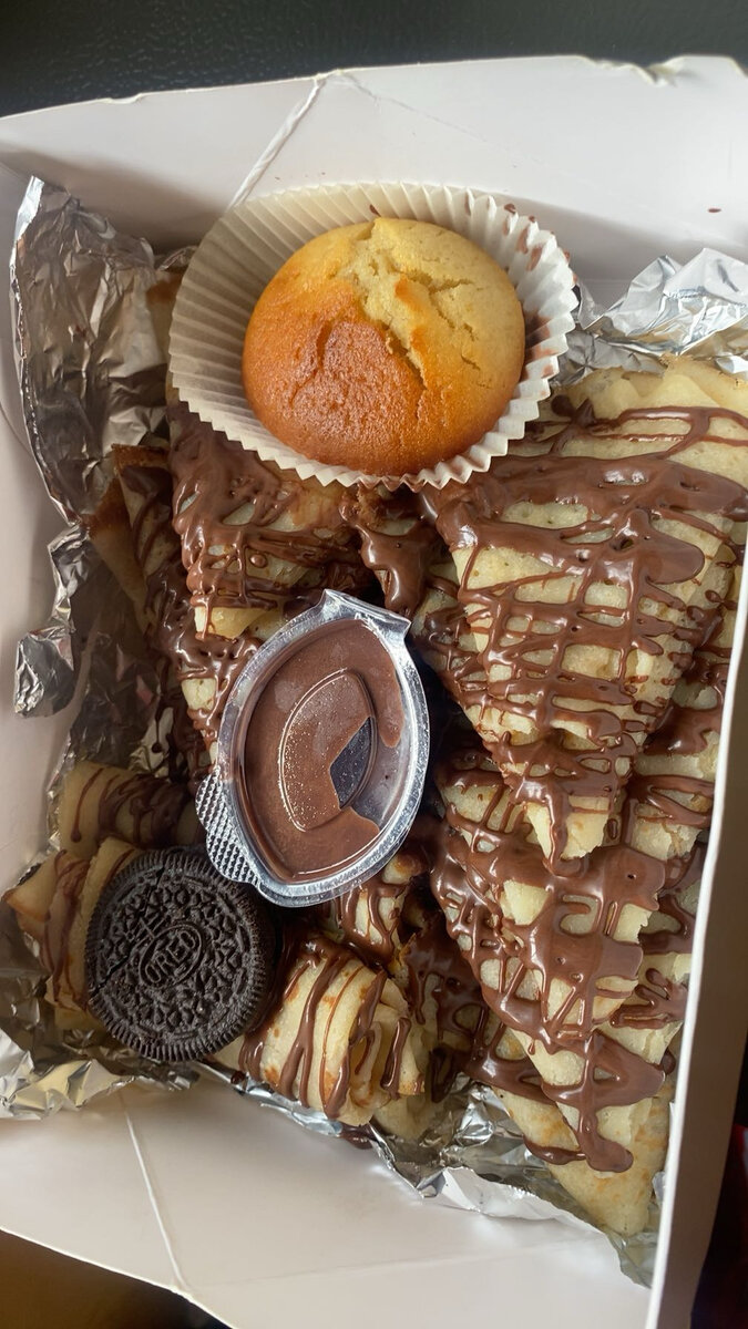 Savourez ces crêpes moelleuses nappées de chocolat fondant, accompagnées d'un muffin vanille et d'un biscuit croquant. Parfait pour les gourmandises à partager, idéal pour une pause sucrée ou un dessert délicieux.