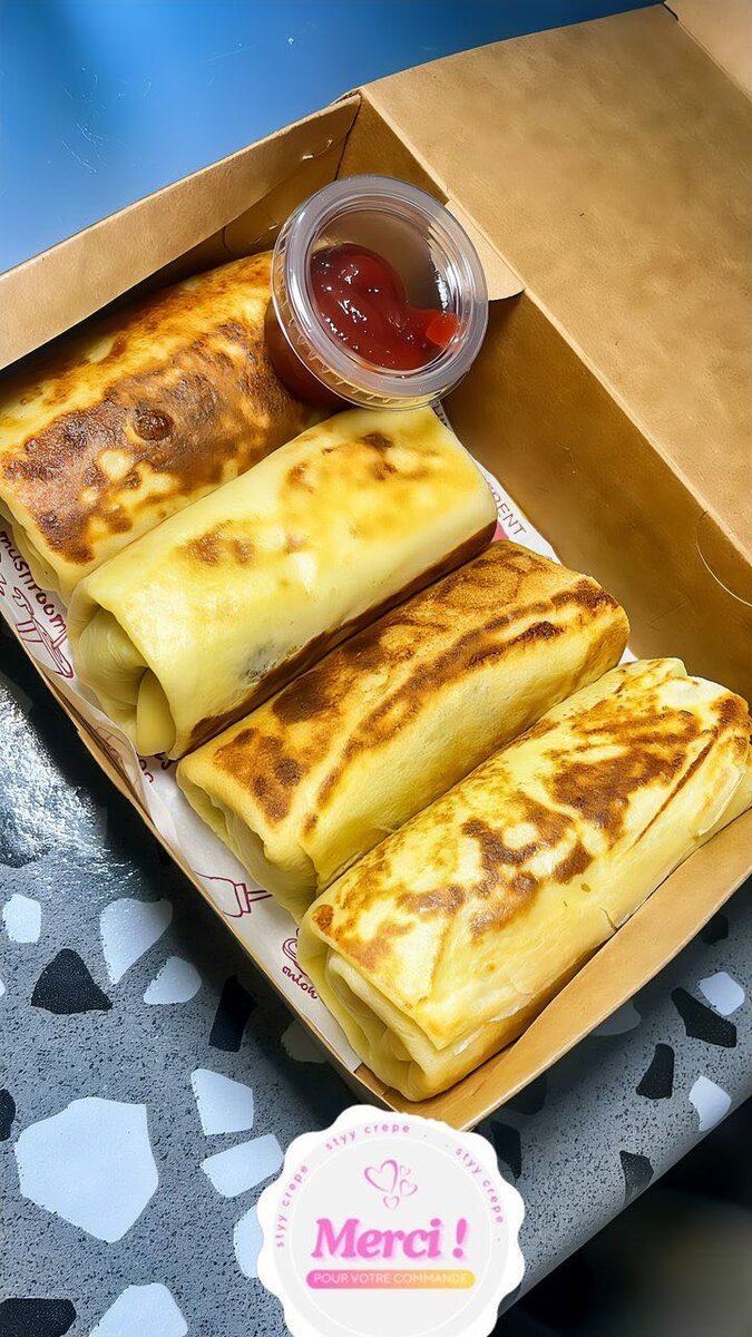 Indulge in our freshly made stuffed crepes, perfect for a quick breakfast or snack. These golden brown crepes are filled with a savory or sweet filling to satisfy every taste. Ideal for busy mornings or cozy weekends, they bring a taste of homemade goodness to your table. Perfect for breakfast lovers.