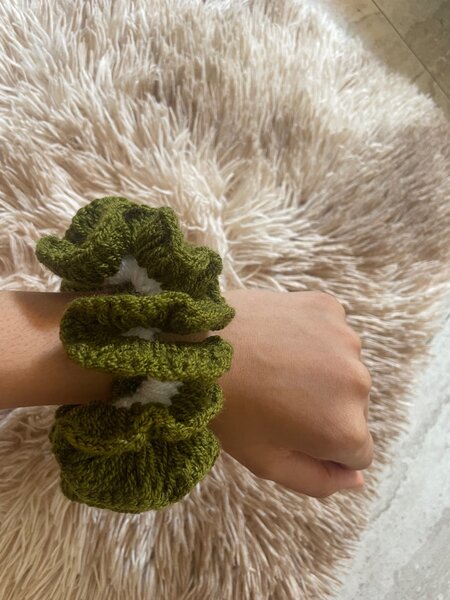 Chouchou fait main en laine pour cheveux .