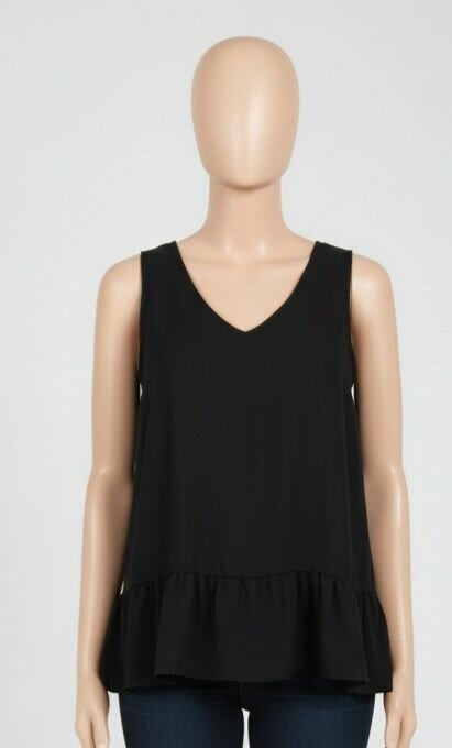 Optez pour l'élégance discrète avec ce débardeur noir à volants. Parfait pour la mi-saison, ce haut léger et fluide s'accorde avec tous vos pantalons et jupes préférés. Idéal pour une tenue chic et décontractée.