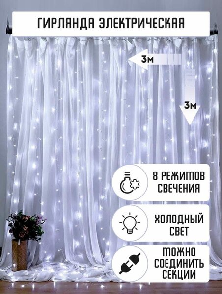 Гирлянда штора 3 на 3, с пультом и с удлинителем. 8 режимов