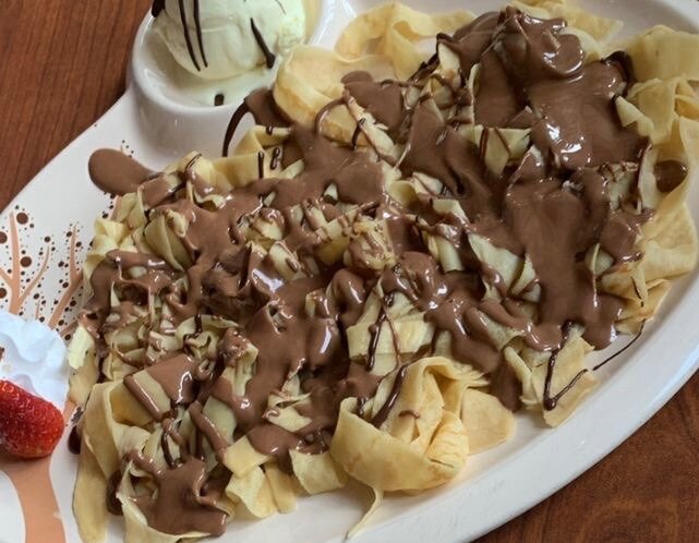 Découvrez nos crêpes croustillantes nappées d'un délicat coulis de chocolat. Parfaites pour un dessert raffiné ou une pause gourmande, elles sont accompagnées de glace et fruits frais pour une expérience culinaire unique. Dégustez ce plaisir sucré idéal pour égayer vos moments spéciaux ou simplement pour vous faire plaisir.