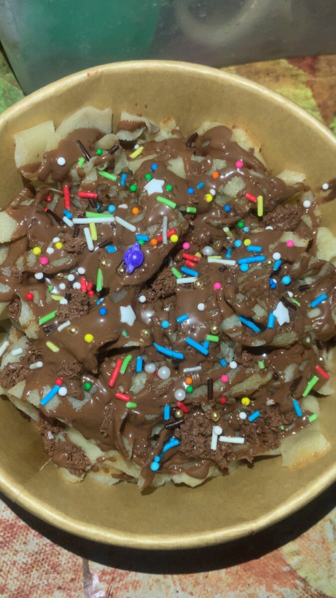 Découvrez notre succulente délice de crêpes fettucine sucrées, nappées de chocolat fondant et décorées de vermicelles colorés. Un plaisir gourmand irrésistible pour les amoureux de douceurs. Parfait pour les fêtes ou une collation spéciale. Offrez-vous ce régal savoureux et coloré dès maintenant !