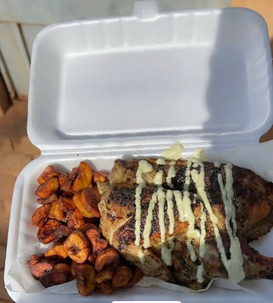 Savourez un succulent poulet grillé accompagné de plantains frits, parfait pour un repas nourrissant et délicieux. Idéal pour les amateurs de cuisine locale.