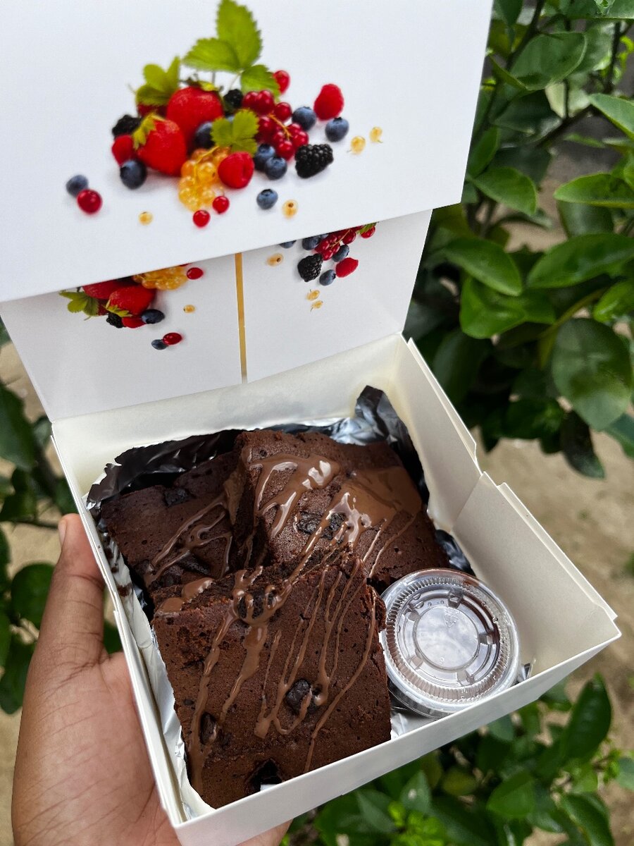 Savourez ces délicieux brownies au chocolat, agrémentés d'un coulis aux fruits rouges, parfaits pour un dessert gourmand. Idéal pour les amateurs de sucreries. Vendu dans une boîte élégante avec design fruité pour une présentation parfaite. Une expérience gustative inoubliable.