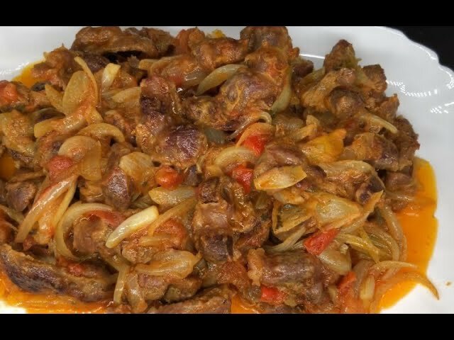 Gésiers bien nettoyés, sautés avec oignons, tomates, piment et épices du bled. Tendre, bien assaisonné, avec un goût qui tape juste parfait avec du riz ou de lattiéké bien chaud !