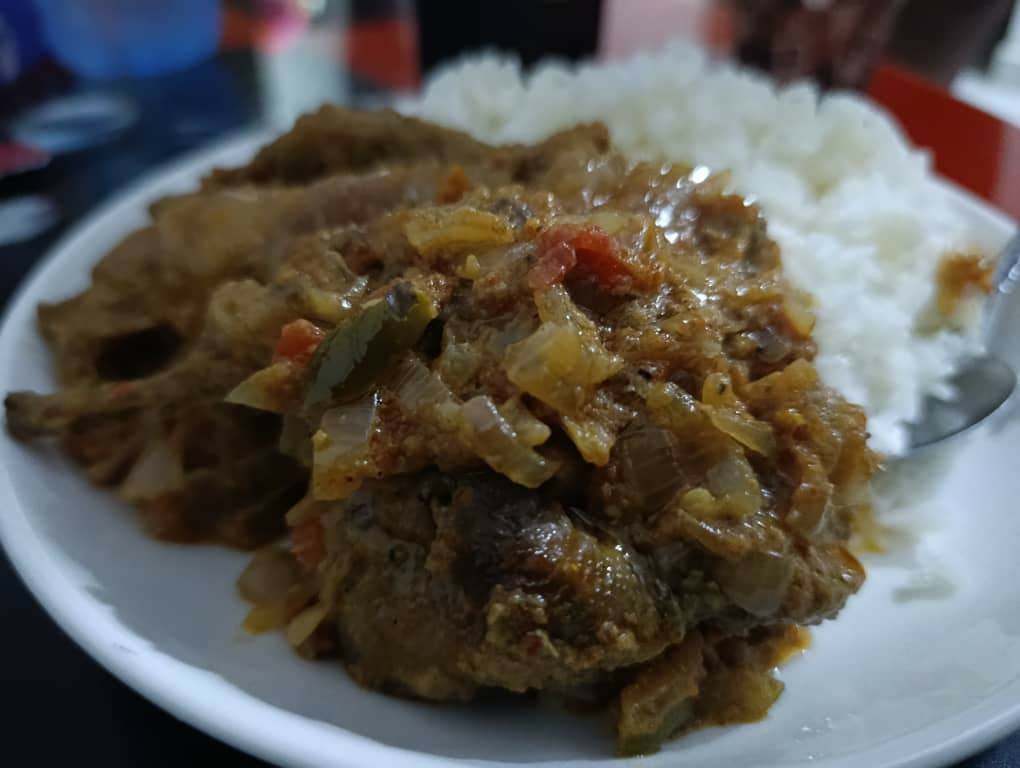 Savourez un plat mijoté riche en saveurs, accompagné de riz blanc moelleux. Parfait pour un dîner réconfortant et simple à préparer. Profitez d'une combinaison harmonieuse d'épices et de textures, idéale pour les amateurs de cuisine maison.