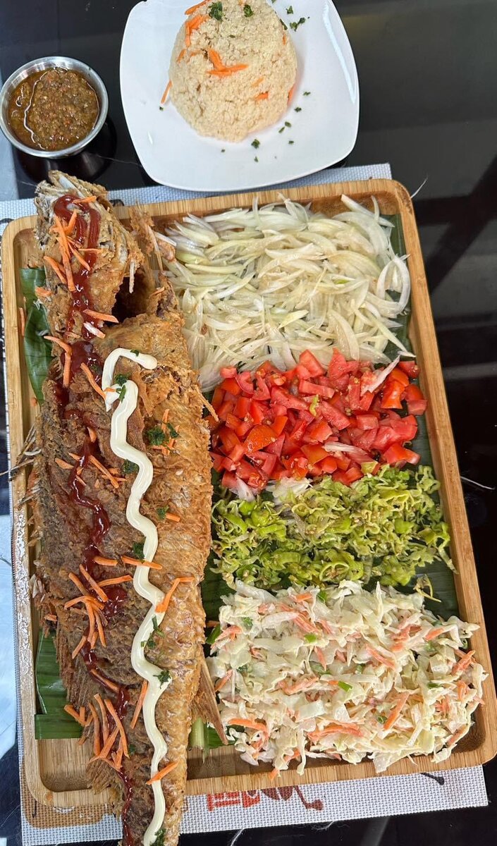 Savourez ce poisson frit croustillant, parfaitement assaisonné, accompagné de légumes frais et d'une sauce piquante. Idéal pour un repas gourmand et convivial. Parfait pour les amateurs de cuisine exotique.