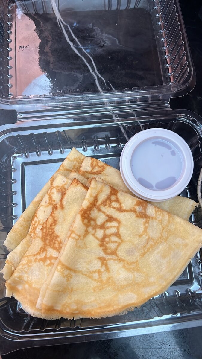 Enjoy these freshly made crepes, perfect for breakfast or dessert. Includes a tasty dipping sauce for added flavor. Ideal for a quick snack or special treat.