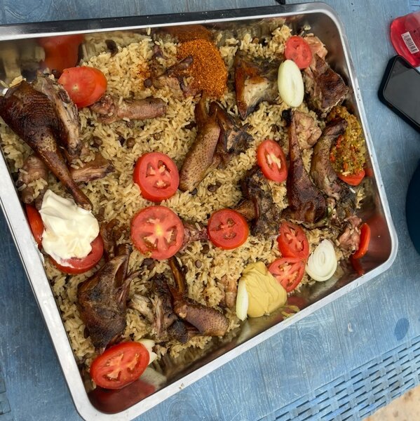 Savourez ce délicieux plat de poulet rôti accompagné de riz parfumé. Parfait pour les dîners familiaux ou les repas de fête. Facile à préparer et irrésistiblement savoureux, ce repas satisfait tous les palais avec des morceaux de poulet tendres et juteux sur un lit de riz parfaitement cuit.